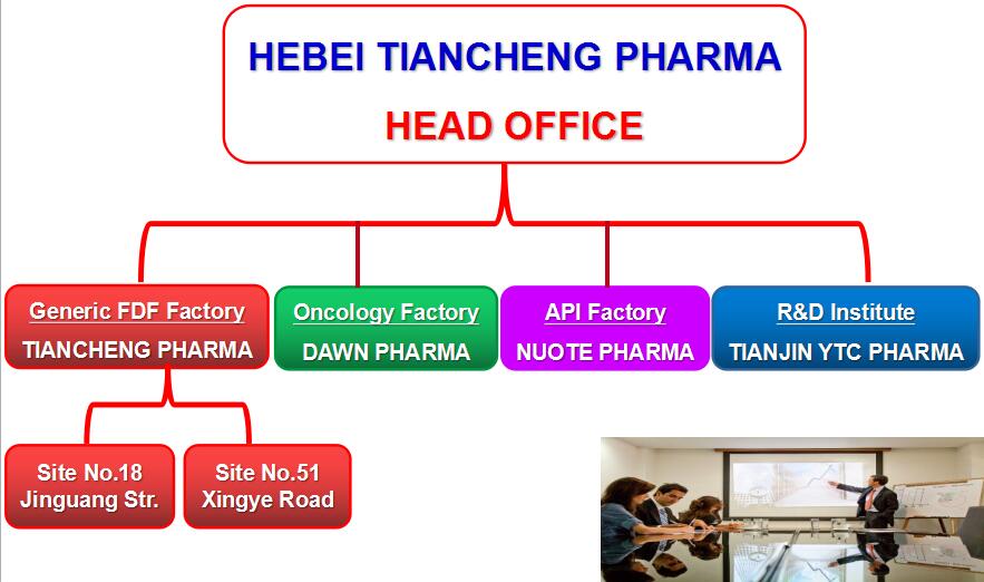 Now Hebei Tiancheng Pharma is a enterprises group containing Tiancheng Pharma (Generic drugs factory which has two sites at No.18 Jinguang Street and No.51 Xingye Road), Dawn Pharma (Oncology drugs factory), Nuote Pharma (API Factory), as well as Tianjin YTC Pharma (R&D Institute).
