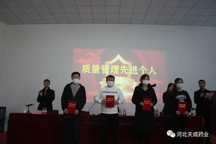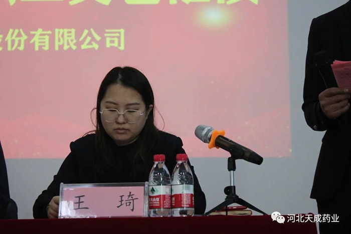 天成藥業(yè)常務(wù)副總經(jīng)理王琦宣讀《對生產(chǎn)復(fù)方對乙酰氨基酚片表現(xiàn)突出人員表彰決定》
