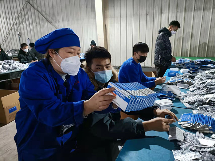常務(wù)副總經(jīng)理王顥介紹道:“受新冠疫情影響,生產(chǎn)任務(wù)較往年更加緊張,積累的訂單也較多,尤其是抗病毒、退燒類口服固體制劑產(chǎn)品訂單劇增。為此公司科學(xué)部署,一方面協(xié)調(diào)渤海分公司部分人員來支援固體車間,同時安排天成藥業(yè)、道恩藥業(yè)后勤管理人員分時段參與包盒;另一方面調(diào)整招聘策略,擴(kuò)招一批臨時包盒工,緩解生產(chǎn)壓力。”