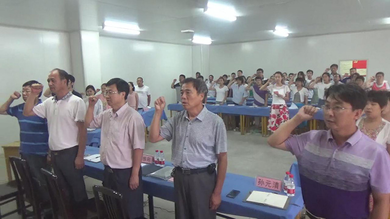 大會(huì)開(kāi)始,全體黨員起立,高唱國(guó)歌,面對(duì)黨旗重溫誓詞莊嚴(yán)宣誓。