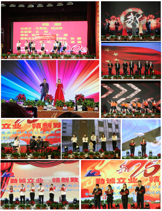 <節(jié)目名稱按圖片排列順序>1.外貿(mào)部、供應(yīng)部演繹《絕代風(fēng)華天成人》2.人力資源部和企管部合唱《天成人》3.渤海分公司合唱《真心英雄》4.輸液一車間舞蹈《美美噠》5.針劑一車間帶來的《走進(jìn)新時(shí)代》6.固體車間小品《昨天,今天,明天》7.銷售業(yè)務(wù)部、銷售服務(wù)部帶來手語表演《感恩的心》8.道恩藥業(yè)詩朗誦《如今,我們已長大》9.銷售系統(tǒng)詩朗誦《改制20周年賀詞》10.生產(chǎn)、質(zhì)量系統(tǒng)詩朗誦《騰飛天成》